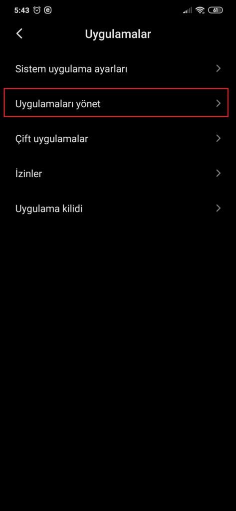 Uygulamaları tıkladıktan sonra Uygulamaları Yönet’e girelim