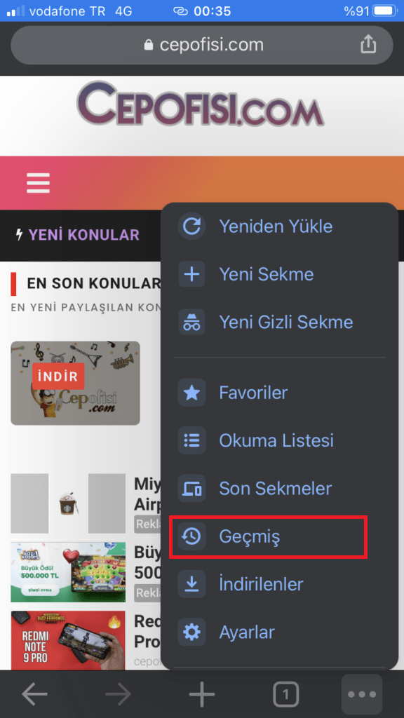 - Ardından Geçmiş seçeneğini görüyoruz ve ona dokunuyoruz.