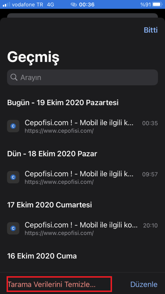 Üstedeki adımları uygulayarak da Tarama geçmişinizi temizleyebilirsiniz.