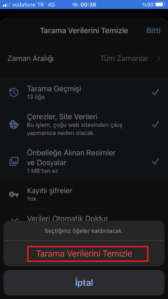 - En alta Tarama Verilerini Temizle Seçeneğine Dokunuyoruz.