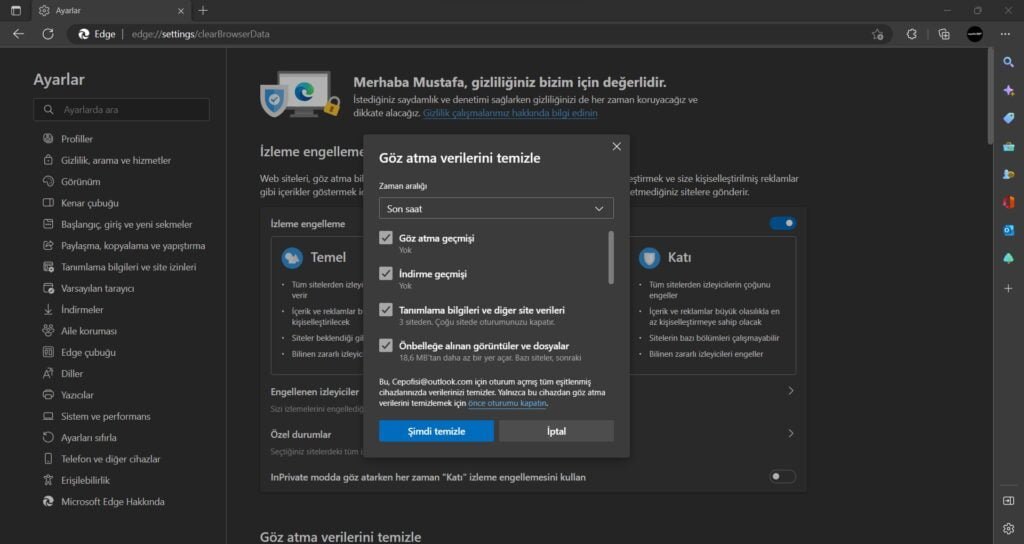 Not: Bu işlem, tarayıcı çerezlerini (çerezler) ve diğer tarayıcı verilerini de siler. Bu nedenle, çerezler sayesinde kaydettiğiniz kullanıcı adları, şifreler ve diğer bilgiler de silinecektir.