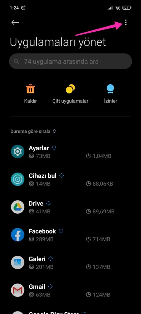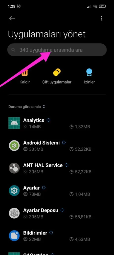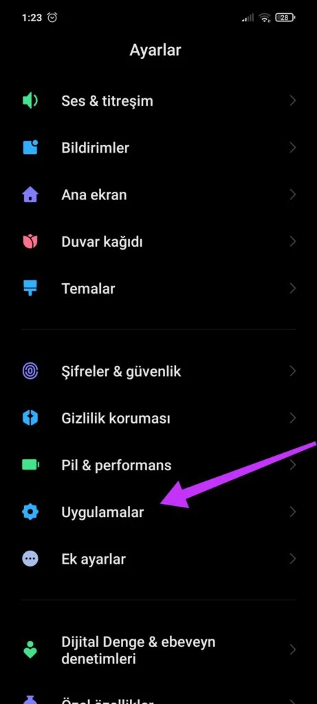 Ayarlar Uygulamalar giriyoruz