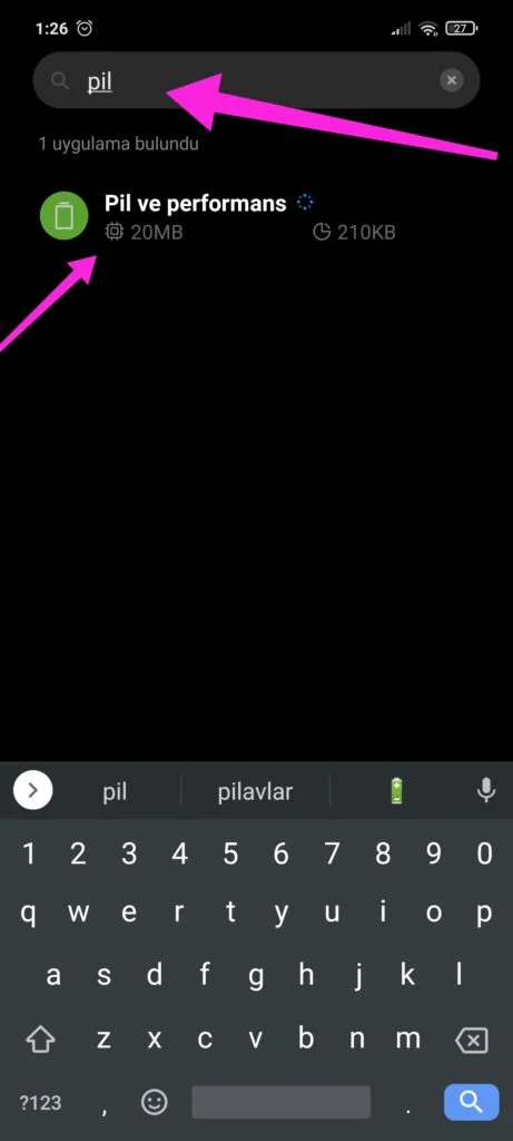 Arama kısmına pil yaz ve pil ve performansa gir