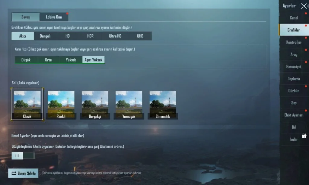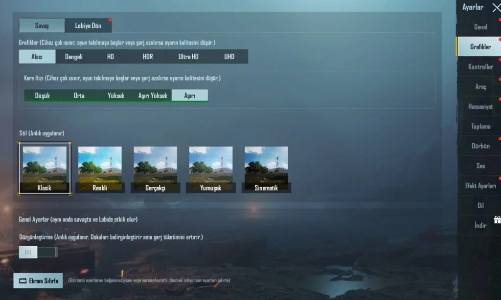 Graphics: Buradaki oyun içi grafik kalitesini ayarlayacağız. Benim tercihim Smooth HD hem oyun içi grafikleri bozmadan hem telefonu yormadan kullanılacak bir ayardır. Eğer oyun içi iyileşme olmadıysa bunu Smooth’a çekebilirsiniz.